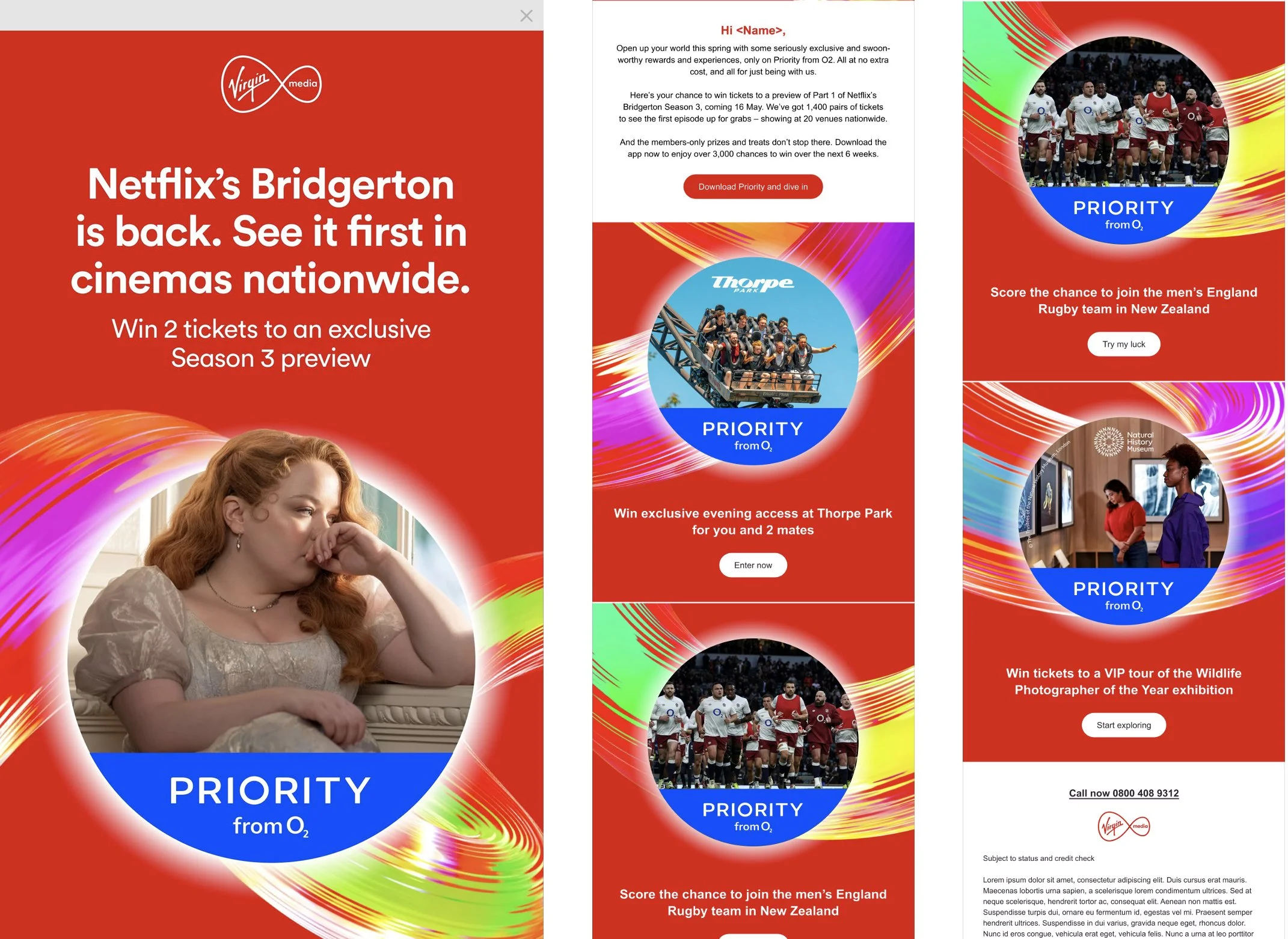 Now that Virgin Media’s part of O2, all of their customers can access Priority rewards, giveaways and experiences. Here’s a little snapshot of some of the promotional campaign work I’ve helped create to encourage customer excitement and engagement…